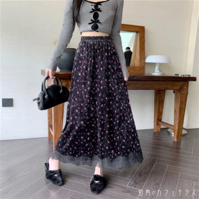 【No.1に挑戦!】ロングスカート マキシ丈 フレア Aライン 伸縮性 ウエストゴム 厚手 ベロア レース かわいい 大人可愛い きれいめ カジュアル 大人 上品 おしゃれ お洒落 レトロ こなれ感 コンサバ系 ラフ とろみ感 抜け感 レディライク ガーリー フェミニン 花柄 秋 冬 誕生日会 20代 30代の通販は