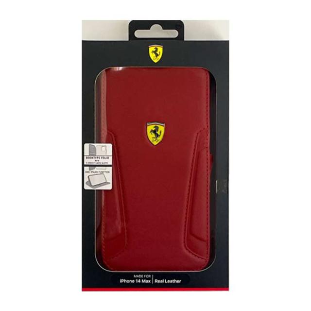 フェラーリ iPhone14Plus用 本革+マイクロファイバー 手帳型ケース。カラーはレッド。高級感ある本革仕様。おなじみのFERRARIのエンブレムがアクセントでおしゃれ。