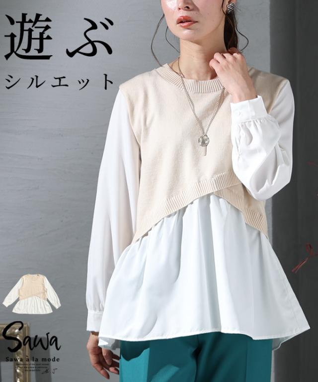 新作モデル冬新作 シルエットで遊ぶレイヤード風異素材トップス レディース ファッション トップス プルオーバー レイヤード風 ベスト ニット シャツ フレア 長袖 30代 40代 50代 60代 サワアラモード sawaalamode otona 大人 cawaii 可愛い 洋服 かわいい服 swjun-777sの通販は