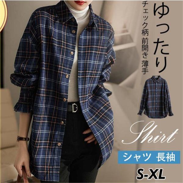シャツ レディース 長袖 ブラウス ロング丈 トップス チェック柄 前開き 薄手 ゆったり シンプル カジュアル 春秋 おしゃれ ルームウエア 大人