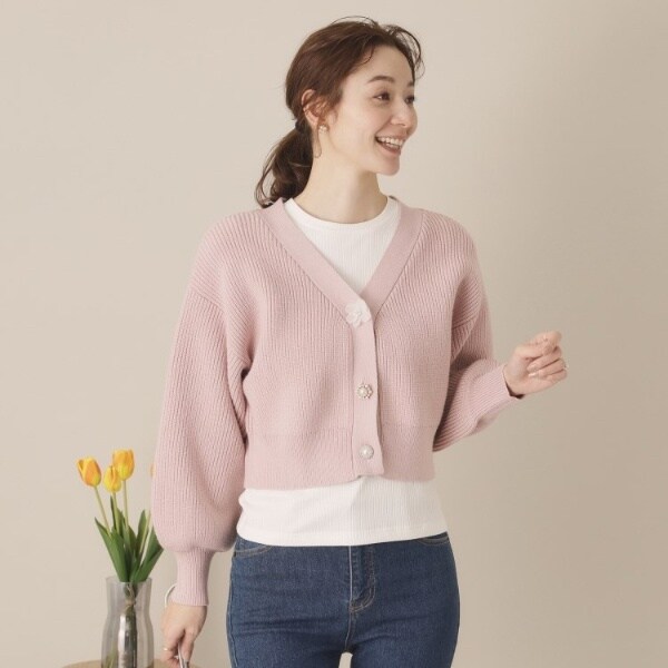 立体的なお花のボタンにきらりと輝く大きめのパール調ボタンは、見ているだけでも気分が上がります。
