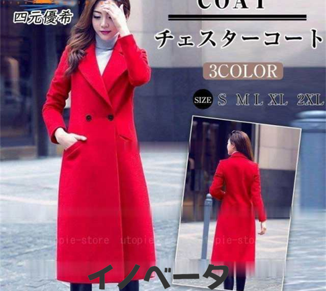 コート レディース ロングコート オーバーコート アウター チェスターフィールド チェスターコート 秋 冬 無地 長袖 上品 ラシャコート レッド