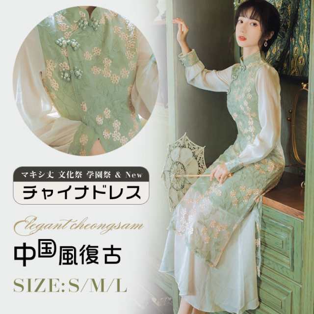 チャイナドレス 中華風ワンピース 春秋 マキシ丈 ロングワンピ レディース ワンピース 長袖 エレガント 普段着 通学 通勤 コスプレ 文化祭 学園祭 中国風復古 衣装 女性 S M L 舞台
