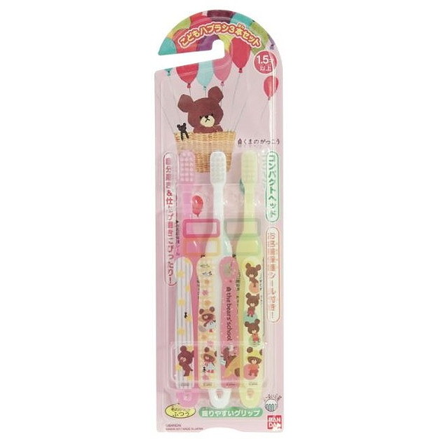 『くまのがっこう』の使いやすいハブラシ3本セット!奥歯まで磨きやすいコンパクトヘッド。仕上げ磨きしやすい太いグリップ。選べる4種類のデザインシール付き!