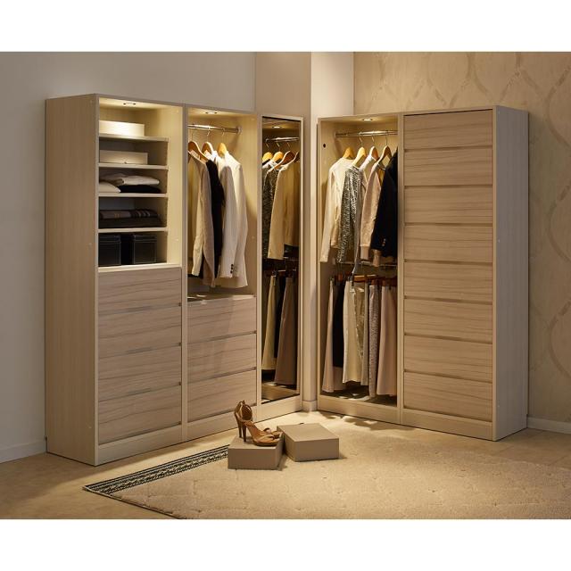 ショップ感覚でLEDがライトアップ。クローゼットを“愉しむ” 空間へ。奥行き40cmのスリム設計なのにたっぷり収納。魅せるオープン収納にチェストやミラーを組み合わせてショップのようなワードローブに。