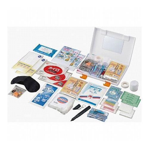 セット内容 : キズテープM(3枚)・ワンタッチ包帯・コットンパフ(3枚)・カイロ・携帯トイレ・マスク(2枚)・カラー綿棒(10本)×各2、専用ケース(25×18×4.5cm)・冷却シート(2枚)・伸縮包帯・ウェットティッシュ・グルーミング5点セット・ガーゼ(大)・サージカルテープ・ポケットレインコート・保温断熱シート・ホイッスルライト(ボールペン付)・安眠セット×各1