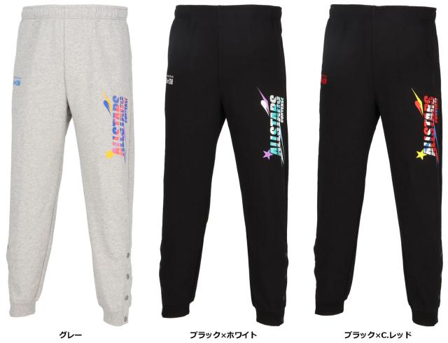 コンバース ALLSTAR を躍動感のあるロゴで表現したミニバス向けスウェットパンツ。シューズの着脱がしやすい裾ボタン仕様。